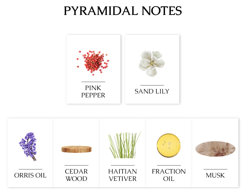 노트 정보: 핑크 페퍼, 아이리스 버터, 샌드 릴리, 베티버, 머스크, 시더